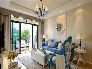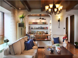 純凈的藍(lán)白色為主導(dǎo)的客廳,柔美的拱形置物架,獨(dú)特的鐵藝燈,原木飾面的茶幾都很好的勾勒出地中海迷人風(fēng)情,讓愜意在生活中暢快流淌....